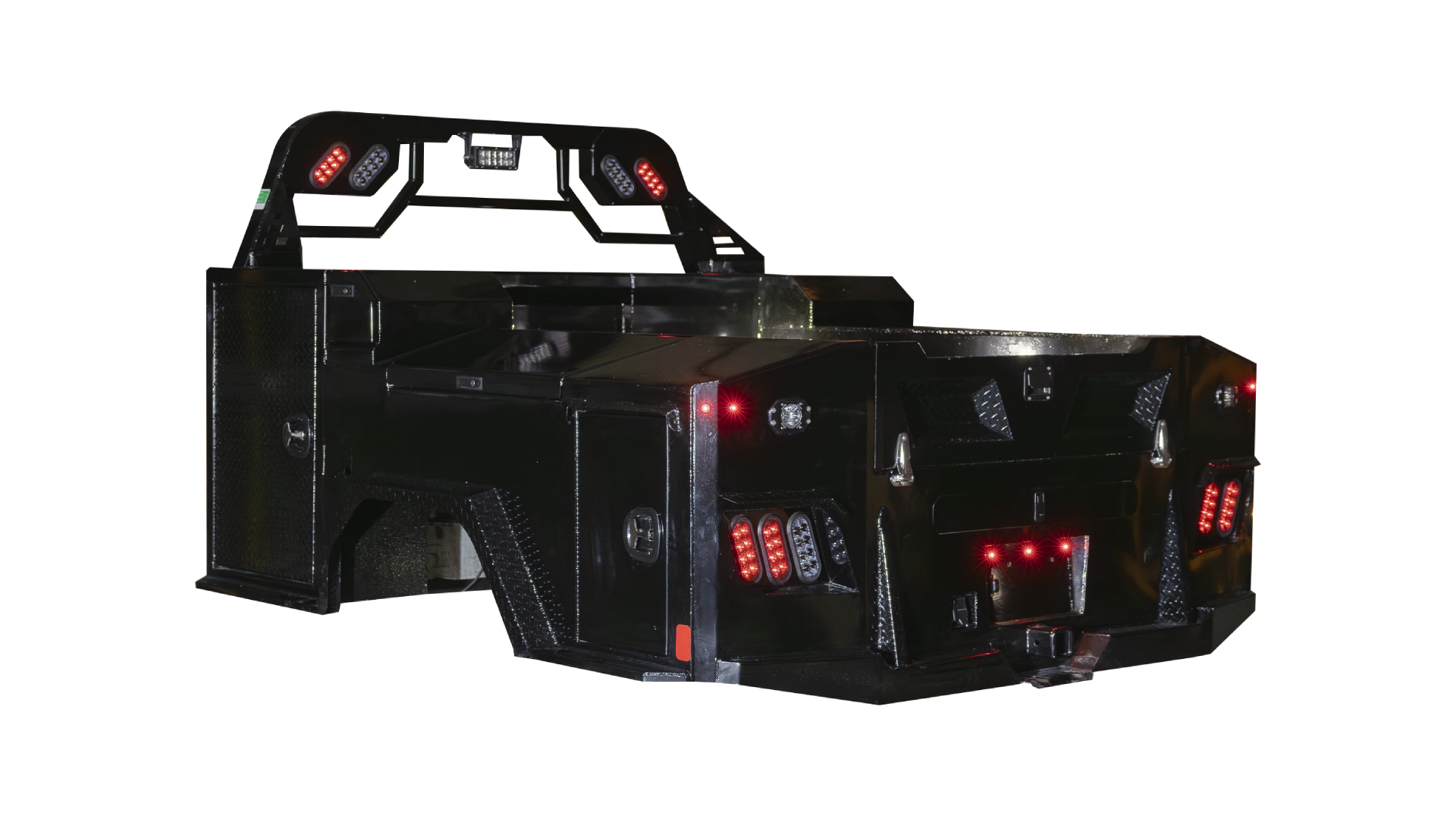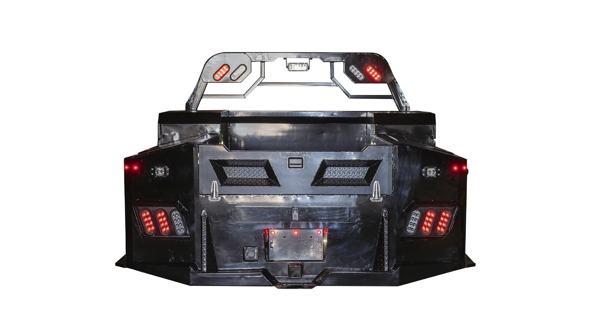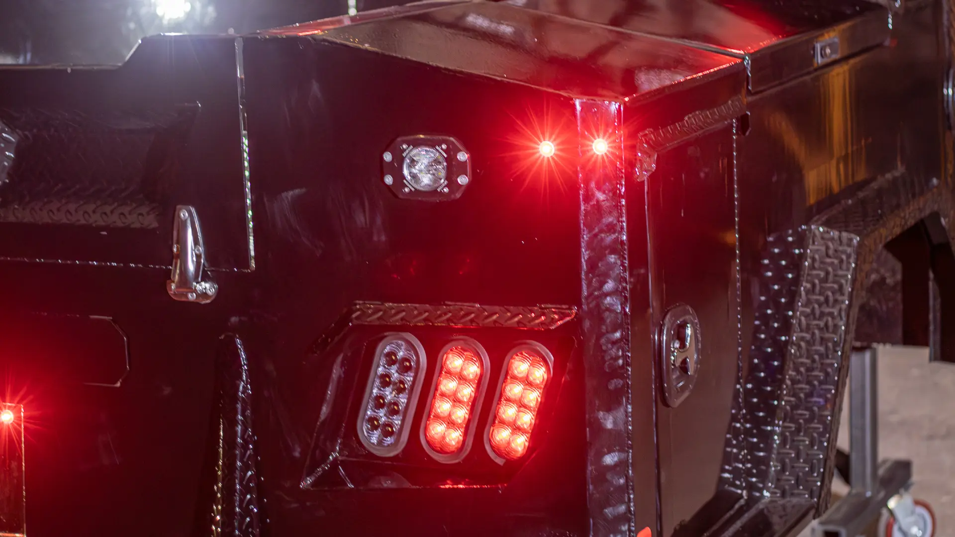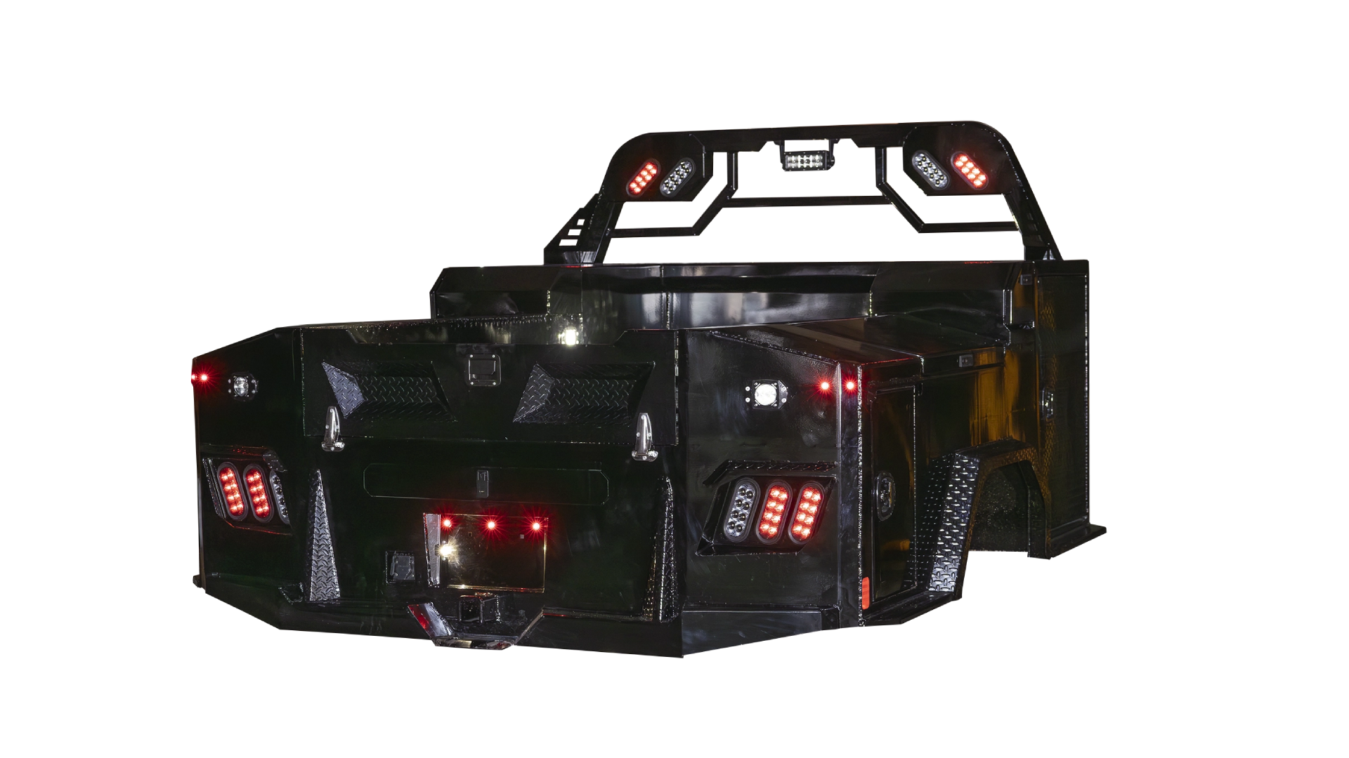 Combines durability and storage versatility with a strong diamond plate steel deck, multiple integrated toolboxes, and advanced LED lighting for reliable performance.